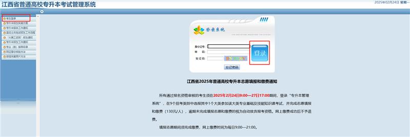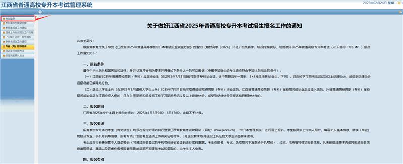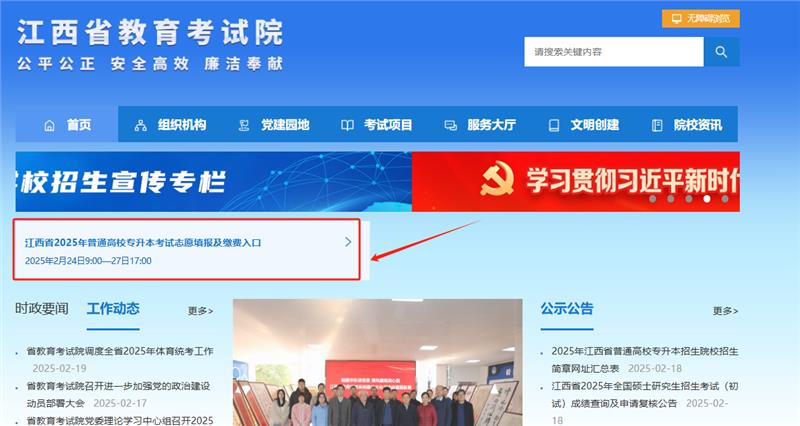 1.登录江西省教育考试院网站(www.jxeea.cn),点击首页“江西省2025年普通高校专升本系统入口”,进入“江西省普通高校专升本考试网上报名系统”。(如下图)